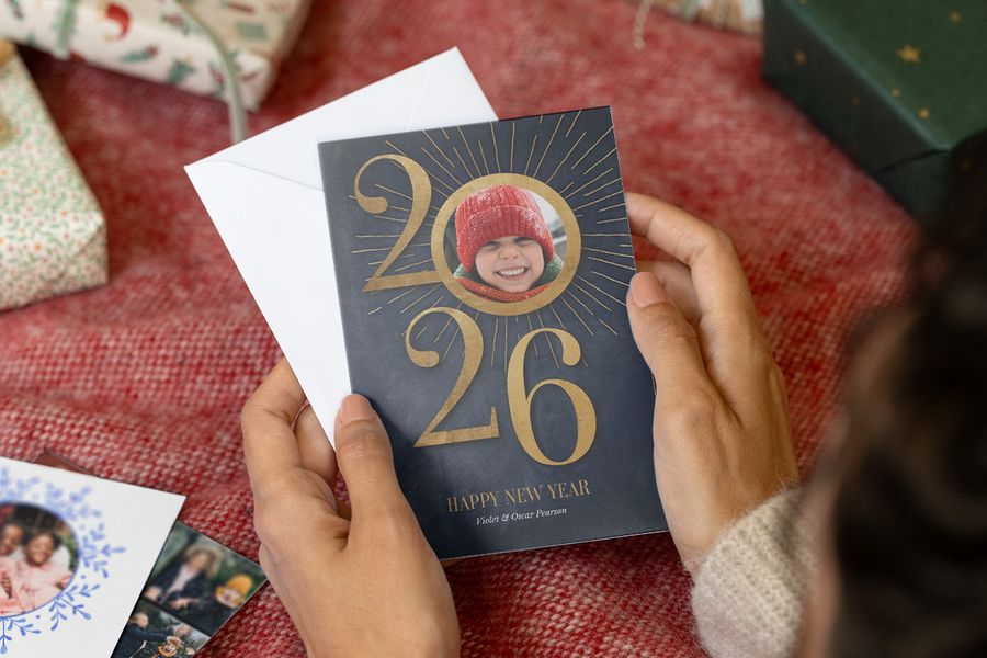 Topidee voor de voorkant van een kerstkaart: heb je groot nieuws voor komend jaar, zoals een bruiloft, een baby of spannende plannen in 2026? Gebruik deze kaart om het te delen en geef zo je beste wensen voor het nieuwe jaar een persoonlijk tintje.